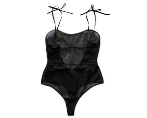 The Emilia Bodysuit features simplistic design lines that hug and shape the natural curves of the body. Taking a cue from the Myah Set, the back features a cut out scoop with adjustable tie shoulder straps. Double layer dotted mesh and a thong bottom allows the Emilia Bodysuit to be layered easily under your leather trousers for a night out. Note: this style is double layer mesh and nipples will be slightly visible Mila is 5'8, size 2, and wears an X-Small Ethically made in Montreal, Canada Due to the nature of our samples, some may have flaws such as slight discolouration or snags in the fabric but all are wearable and in functional condition. All samples are final sale and not applicable for a refund or exchange.
