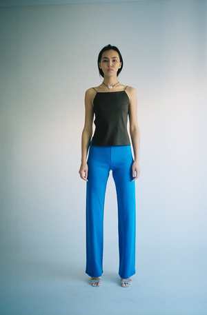 Square neckline top with an open back. Criss-cross thin elasticized bands. In dark brown, Elm color.