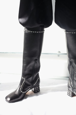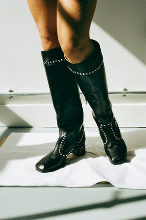 A pair of knee high studded boots with a square toe, block heel and side zip. MARYAM NASSIR ZADEH -Black -100% Leather -Made in Italy -Heel measures 5cm / 2inches -Fit true to size Worn with BASERANGE Toteki pants and HOSBJERG Jasmine blazer