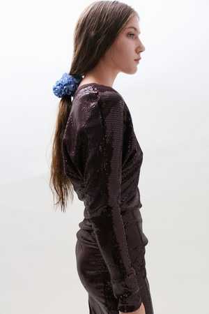 Hair scrunchie in shiny French blue. Furled silk resembling carnation petals. Can be worn in the hair or adorned on the wrist or ankle. Material: 100% Polyester.