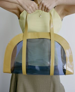Maryam Nassir Zadeh Zelda Bag in Honey - Vintage-inspired shoulder bag in Violet color PVC and Honey yellow patent leather trim and strap. Top zipper closure. Curved bottom. Unlined. - Strap drop 10 - Made in Italy