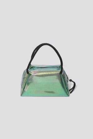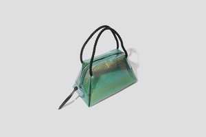 Lightweight semi-transparent purse in iridescent green vinyl. Zipper with leather pull, geometric structure that is compact in size but spacious enough for the essentials. Corded black handles. Made in Italy. Maryam Nassir Zadeh cites her grandmother's store in Iran as one of her initial sources of inspiration.