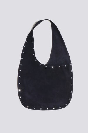 Sculpted ovular shoulder tote in black suede, detailed with a wide flat strap and subtle diamante studs along the edges. Dimensions: W 14" x H 22" inches. Material is 100% Suede Leather. Made in Italy.