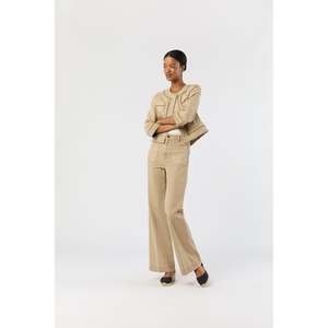 A pair of jeans that nails that elusive combo of laid back and polished: a slightly flared column leg with a full-length inseam and a rise that hits right at the natural waist. The Camille is finished with patch pockets at the hip and flap pockets at the back, all in a wear-with-anything shade of khaki canvas. Like any true cotton canvas, it starts out with quite a bit of structure these are the kind of jeans you may need to wiggle into at first but it will soften and ease up on the body with wear. - Stretch cotton canvas - 99% cotton / 1% elastane - Antique brass tack button - High rise - Flared leg - Front patch pockets - Back flap pockets - 32" inseam on size 27 - Made in China - Machine wash, tumble dry low, low iron. Do not bleach.