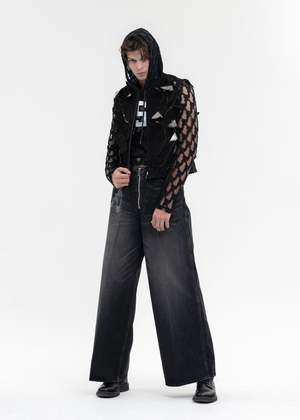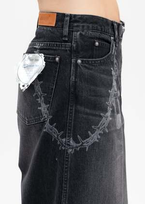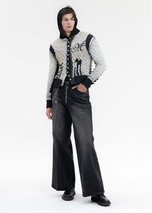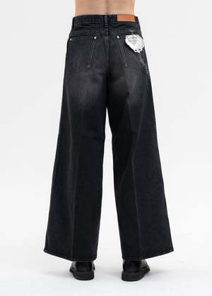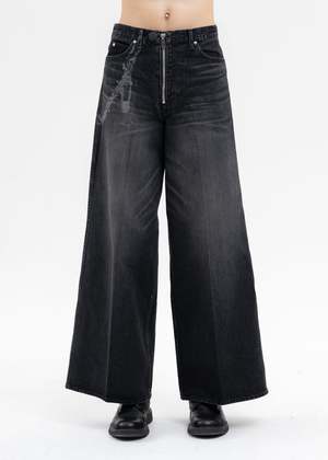 Masuboys baggy denim trousers in faded black, from MASU. Features a paneled relaxed fit with five pocket styling, silver-tone hardware, contrast-stitch detailing, and a zippered closure. Laser-etched chain and key-ring detailing along the right thigh. Finished with pleat lines across either face. Regular Fit 100% Cotton Imported Model is wearing size 46 Model is 6' (183 cm), 125 pounds (56 kg), usually wears M in tops. A size 30 in denim and 46 in trousers. Size 10 in shoes.