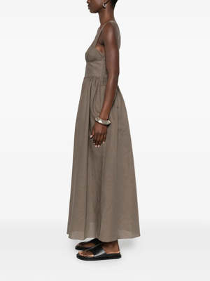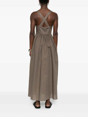 The Crossback linen dress by Matteau features a wide, square neckline and exaggerated crossback detailing. This silhouette is designed in a breathable linen blend fabric in a maxi length. Product Details: - Designer ID: ED2-2025-D2 - Color: Myrtle - Composition: 55% Linen, 45% Cotton - Imported.