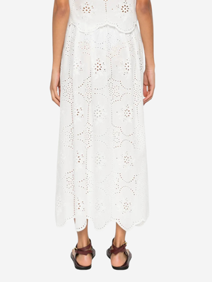 The Broderie Midi Skirt by Matteau features a delicate floral broderie design with a scalloped hem finish and elastic waistband. This piece is unlined, offering an element of sheerness through the broderie fabrication. Product Details: Designer ID: BRMSK Color: White Composition: 100% Cotton.
