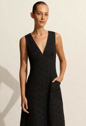 - sleeveless midi length dress - plunging v-neck - fitted through bust + hip - fully lined - 100% organic cotton - austrailian sizing