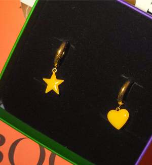Look out for your shooting stars! Wearable both sides, find yourself donning on these everyday & everywhere. The star pendants are double sided, attached to quality gold hoops intended for daily wear. This listing is for a SINGLE earring, be free to mix & match with other colours! Star pendant made in double sided enamel on gold plated stainless steel Pendant measures approx. 11mm each, with embossed logo2 at the side Hoops made in 18k gold PVD coating on stainless steel, measuring at 1.5cm Perfect for daily wear Resistant to tarnish and corrosion Nickel free Comes with Matter Matters jewellery box and care card
