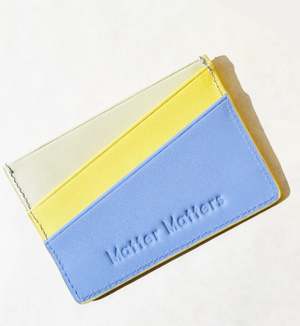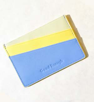 Guaranteeing swift transfers between handbags, our multicolour card case is crafted with quality leather to keep up with the motion. Holds up to 5 cards, perfect for slotting your credit cards (or in our case coffee stamp cards). Fits perfectly (physically and aesthetically) with all our bags. Four side card slots with a compartment slot in between, finished with hand painted edges Embossed designer logo2 in front and 'Good Enough' embossed detail at the back Forget me not, lemon and light beige grained-leather panel Navy canvas lining