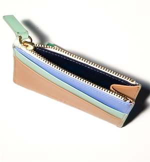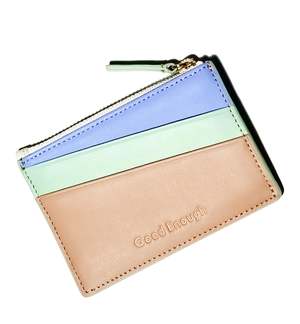 Guaranteeing swift transfers between handbags, our multicolour card case is crafted with quality leather to keep up with the motion, with an added zip for security. Perfect for slotting your credit cards (or coffee stamp cards), fits perfectly (physically and aesthetically) with all our bags. Four side card slots with a zipper compartment in between, finished with hand painted edges Embossed designer logo2 in front 'Good Enough' embossed detail at the back Warm brown, mint and forget-me-not grained-leather panel Navy canvas lining