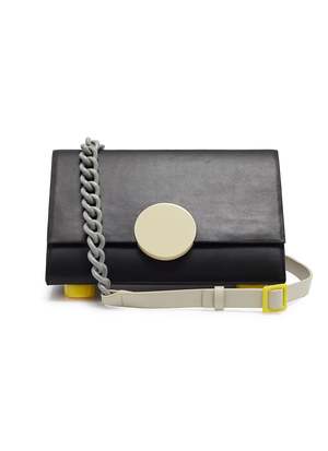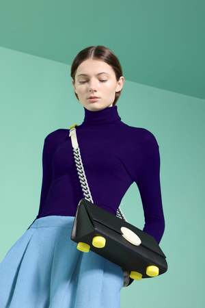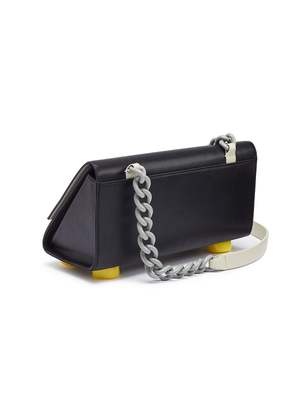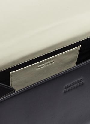 The Matter Matters OG bag, Pythagoras' shoulder bag has an unusual gusset of a right-angled triangle. Meticulous trials of mathematical calculations were involved to make this bag happen. H:14 cm W: 27.5cm D:11cm Adjustable leather shoulder strap Embossed designer stamp under bag flap Blue sprayed chain metal chain Canvas lining FREE Comes with matching 'Good Enough' Multicolour card holder - Black (subjected to availability)