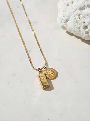 Bring on the gold! 18k gold PVD coating on stainless steel Intended for daily wear Waterproof and sweatproof Resistant to tarnish and corrosion Nickel free Measures: Gold bar pendant length: 1.1 cm; pendant width: 0.5 cm Necklace length: 40 + 5 cm / 17.5 in Comes with velvet jewellery box and care card
