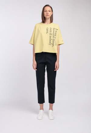 If you don't already know, Matter Matters clothing live by classic & comfort. Mid-rise with a slim leg silhouette, these trousers closes in neatly, gathering above the ankles. Completed with an embroidery detailing in the zipper flaps, very handy when you wish to perform an unconventional greeting gesture (at your own risk). Wear them with loafers to suit the occasion, or dress down with sneakers. 69% Polyester / 27% Rayon / 4% PU Size: XS / S / M / L Fits true to size, but feel free to size up for curvy hips Middle-rise, cut for a slim fit Mid-weight, stretchy fabric Two side and two back pockets Zip fastening with button closure Belt loops 'HELLO' embroidery detail at zipper Hand wash cold Model is 180cm tall, Bust 34" Waist 26" Hips 36" and is wearing size M