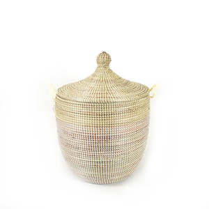 Maker: Mbare This versatile African basket adds a touch of hand made global decor to any room. A perfect storage container, it has both practical functionality and contemporary style. This basket looks great with the other two-tone baskets in the set as a focal point in any room.Wolof women in rural Senegal weave these baskets from millet grass, and colorful plastic threads which add strength and durability. Dimensions: Height: 20" x Width: 14.5" Weight: 4 lbs Artist: Deco Art Senegal Made in: Senegal Description tag The Medium Two-Tone Baskets are made from cattail plants & white plastic threads. Use this as a laundry basket, for storage, or a simple decorating accent. Height 15 Title tag Medium Two-Tone Basket - Natural + White | Mbare Width 20