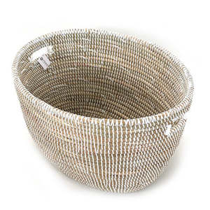 Maker: Mbare This minimalist White Oval Basket adds a touch of handmade global decor to any room. A perfect storage container, it has both practical functionality and a minimalist, contemporary look that would look at home practically in any space. Use it for towels in the bathroom, to store throw pillows in the living room or bedroom, or even to collects toys in the kid's room - its uses are endless! Wolof women in rural Senegal weave these baskets from millet grass, and black plastic threads which add strength and durability. Height: 11 Width: 18.5 Depth: 15" (measurements are approximate)