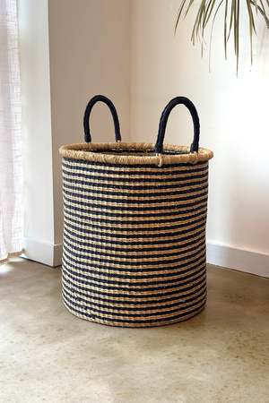 This handwoven hamper combines functional storage with natural style. Featuring a striking natural and black stripe pattern, it keeps laundry organized while adding a decorative accent to your home. The sturdy, handwoven construction is designed to handle family-sized loads, and the generous large size means fewer trips to the washing machine. The smooth, natural texture and subtle, earthy aroma of the woven material enhance its artisanal feel. Comfortable, wrapped handles make it easy to transport loads from room to room. PRODUCT FEATURES: - Handwoven from natural materials for a unique, artisanal look. - Generous large size to accommodate family-sized loads of laundry. - Distinctive natural and black stripe pattern adds a touch of modern style. - Sturdy construction with comfortable, wrapped handles for easy transport.