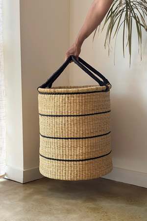 This beautifully crafted, hand-woven laundry hamper keeps stray socks and towels neatly tucked away, contributing to a more serene atmosphere. Its generous capacity easily holds a week's worth of clothes, from tiny toddler outfits to bulky adult bedding, helping keep your living spaces tidy and your laundry routine streamlined. The natural woven texture adds a touch of warmth and organic charm to any room, softening the often-mundane task of laundry. Sturdy, woven handles make it easy to transport loads to the washing machine, even when full. This isn't just a hamper; it's a stylish solution that brings order and a touch of artisanal beauty to your home. PRODUCT FEATURES: - Generous capacity to hold a significant amount of laundry, reducing the need for multiple hampers. - Hand-woven construction offers a unique, artisanal aesthetic that complements various home decor styles. - Sturdy, woven handles provide a comfortable and secure grip for easy transport. - Cylindrical shape offers a compact footprint while maximizing storage space.