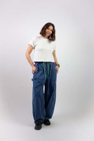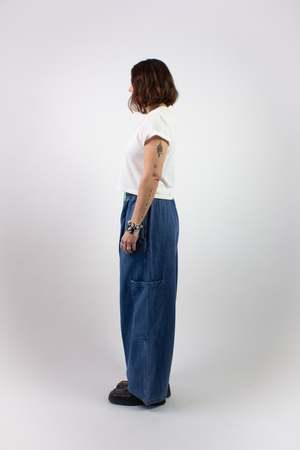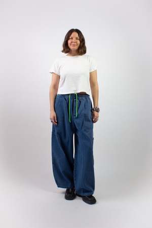 The Chef Pant by Meals is a versatile everyday pant made in the USA from 100% cotton heavy denim. It features an elasticated drawstring waist, a wide cropped fit, and five pockets: two on-seam pockets, two side patch pockets, and one back right patch pocket. It also includes a carpenter-style loop. The pant features a neon green interior drawcord that can be styled tucked in for a more neutral look or left peeking out for a pop of color. Fabric care information Wash cool with a neutral detergent and separate lights from darks. Do not bleach. Tumble dry permitted.