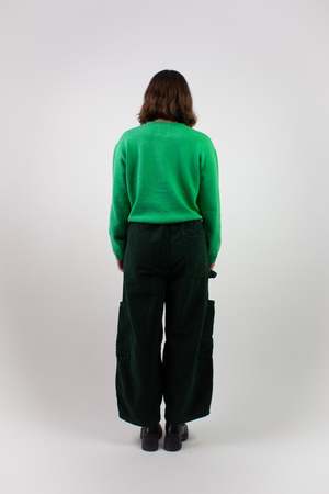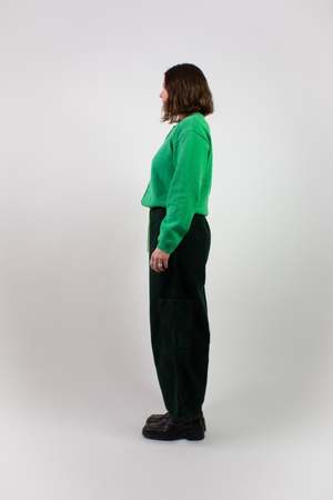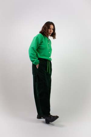 The Chef Pant by Meals is a versatile everyday pant made in the USA from 100% cotton 4-wale corduroy, cut on the horizontal grain. It features an elasticated drawstring waist, a wide cropped fit, and five pockets: two on-seam pockets, two side patch pockets, and one back right patch pocket. It also includes a carpenter-style loop. The Chef Pant features a neon green interior drawcord that can be styled tucked in for a more neutral look or peeking out for a pop of color. Fabric care information Wash cool with a neutral detergent; separate lights from darks. Do not bleach. These pants can be tumble dried. Fabric information 100% Cotton