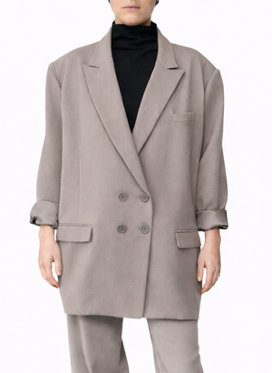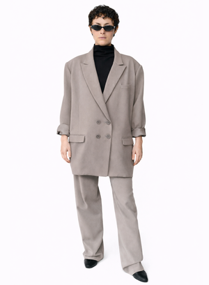 Who doesnt love an oversized mens blazer! The cashmere-like fabric makes this piece feel soft to the touch, and its energy pairs perfectly with the matching watch-pocket pants for an amazing suit. Even better over a party dressslip your arms into the side-seam slits to create a chic cape effect. This style features: - Oversized men's jacket - Welt pockets - Fully lined - Side slits give way to armholes - Fabric content: 63% Polyester / 33% Rayon / 4% Spandex - Dry clean only Available in Taupe, Navy, Black, and Charcoal. Designed by Meg in Brooklyn, NY. Imported. Style: MKFW2530.