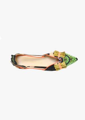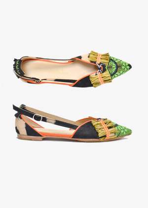 The Greta Slingback by Meher Kakalia is a low, handmade point slingback shoe featuring precious hand embroidery created with fine metal coils and beading. The upper is crafted from tie dye suede leather with hand embroidered tip and recycled plastic raffia detailing, offering a sense of fun and texture. Lined with goat leather and finished with a cow leather sole and a 2-part rubber outer for durability. Fits true to size.