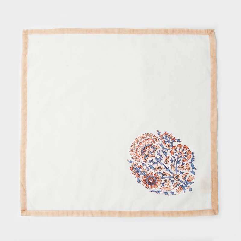 Add warmth and handcrafted elegance to your dining table with the Saffra Floral Block Printed Cotton Napkins. This set of four cloth napkins features a delicate floral motif printed on a soft ivory base, accented with intricate peach and blue block printed borders. Created using traditional hand block printing techniques, each napkin reflects the craftsmanship and heritage of skilled artisans. These reusable cotton napkins combine beauty and elegance, making them perfect for everyday dining as well as festive table settings. Dimensions Length: 18 inches Width: 18 inches Set Includes: 4 cloth napkins.