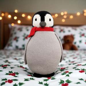 This squishy hand-knit penguin plush toy is perfect for winter cuddles. It stands 10" tall and features a 100% cotton exterior with polyester filling. Hand wash and air dry recommended. Handmade and fairly traded by knitting artisans in Peru.