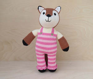 Cuddle up with this curious fox wearing adorable pink striped dungarees. 12" tall 100% cotton exterior, polyester filling Hand wash, air dry Handmade, fairly traded Our whimsical designs are handmade by knitting artisans in Lima and in remote rural villages in Peru. We work closely with organizations dedicated to empowering women through income generating projects. They enjoy a safe work environment and earn a living wage with a respect for their cultural traditions.