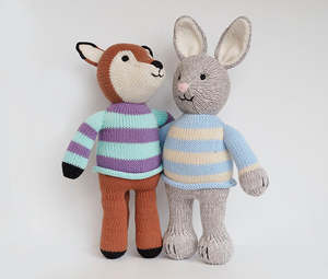 Adorable knit bunny toy, dressed in a soft blue-and-cream striped sweater. Meticulously handcrafted from gentle, durable yarn, its made for cuddling and play. The bunnys sweet embroidered features and upright ears add a dose of whimsical charm, making it an ideal companion for children and a delightful gift for baby showers or Easter baskets. Its timeless design and high-quality construction ensure it will be treasured for years to come. 12" standing 100% cotton exterior, polyester filling Hand wash, air dry Handmade, fairly traded Our whimsical designs are handmade by knitting artisans in Lima and in remote rural villages in Peru. We work closely with organizations dedicated to empowering women through income generating projects. They enjoy a safe work environment and earn a living wage with a respect for their cultural traditions.