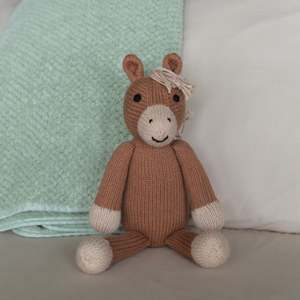 This adorable knitted horse stuffed animal features a soft and cuddly texture, perfect for snuggling. Handmade by knitting artisans in Lima and remote rural villages in Peru. 11" tall 100% cotton exterior, polyester filling Spot clean, air dry Handmade, fairly traded