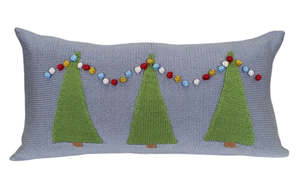 This charming knit holiday throw pillow features a trio of Christmas trees adorned with colorful garland, creating a festive scene against a steely blue background. The simple yet vibrant design brings a cozy and joyful atmosphere to your home, perfect for the holiday season. Crafted from high-quality cotton yarn, this pillow adds a cozy, seasonal flair to any room. Whether placed on a couch, chair, or bed, its vibrant colors and unique design are sure to catch the eye and bring holiday cheer to your space. 10" x 20" 100% cotton Pillows include a cotton/polyester insert made in the USA. Hand wash with mild soap; lay flat to dry. Hand-crocheted button closure on back. Handmade, fairly traded. Our pillow covers are handmade in Armenia.