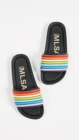 The perfect slide from beach to street! Colors: Black or White with rainbow stripe Fits true to size, order your normal size Molded footbed Open toe; slip on 3-D rainbow stripe detail on strap Rubber Sole Made in Brazil