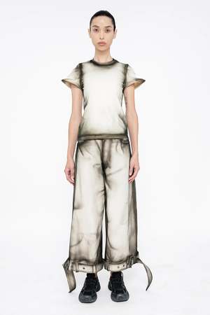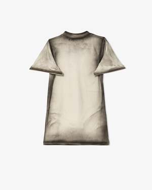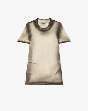 This T-shirt by Melitta Baumeister is made of a stretch cotton jersey with spray painted seams and hems. The sleeve hem has boning to help it stick out from the arm.