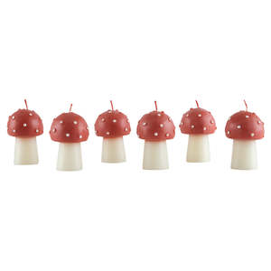Set of six mushroom-shaped candles made from ivory wax with red wax tops and red wicks. Fragrance free. Burn time approximately 2 hours. Dimensions: H 6.5 cm Style number: 279978.