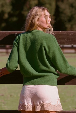 The Tex Sweater in hunter green is a one-size style. The model is a size small. It can be comfortably worn by sizes XSM but will not be a good fit for a size L. The fit is loose, comfortable, and perfect for fall in a unique color. Made from a recycled blend of fabric that is super soft and comfortable. - Loose, comfortable fit - 100% recycled fabrics - Dry clean only - Made with love in the USA Condition: New.