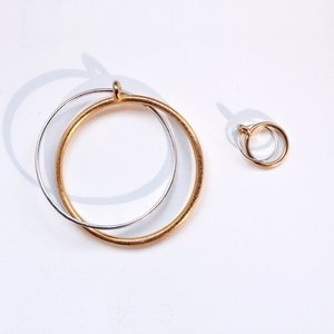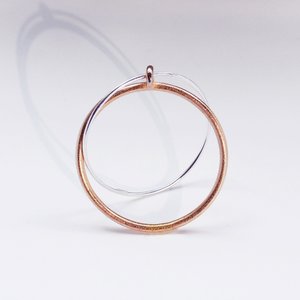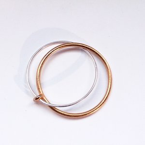 Two interlocking and interweaving hoops, one silver and one steel/bronze. These rings form a minimal classic and timeless shape for everyday wear. Made in Los Angeles