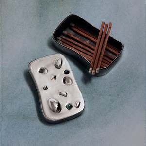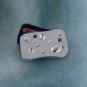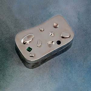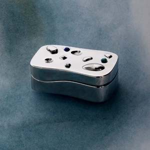 A sculptural container inspired by Isamu Noguchi's children's playground topographies, the Playscape Box evokes moments of discovery and play. Its playful and organic silhouette is 3D-printed in stainless steel and hand-polished to a mirror finish, punctuated by inlaid malachite and blue lapis stones. Designed for versatile useas a matchbox, pill box, or vessel for small keepsakesthis box invites everyday rituals to become acts of intimate interaction and quiet reverence. Overall dimensions: 2" W x 3.25" L x 1.25" H. Made to order. Please allow 2 weeks for production.
