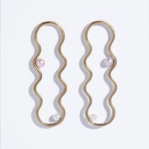 Continuous arched earrings with unexpected pearls set in unexpectedly off-center. Brass, sterling silver post/back, two 4mm freshwater pearls. 3/4" across (at widest point), 2-1/4" tall Made in Los Angeles