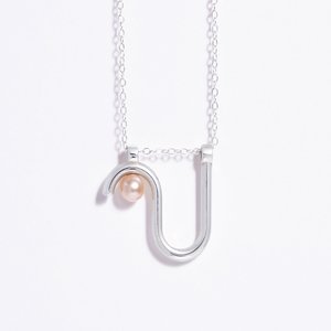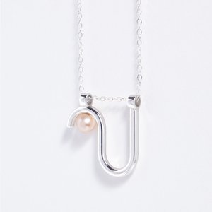 Asymmetrical, double-arched high-polished sterling silver pendant with an unexpected pearl accent. Approx. 6mm diameter natural color freshwater pearl. 19" long sterling silver chain. Overall 1-1/8" across, 1" tall Made in Los Angeles