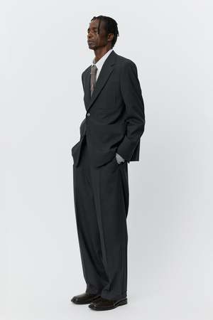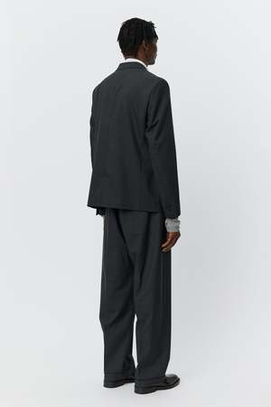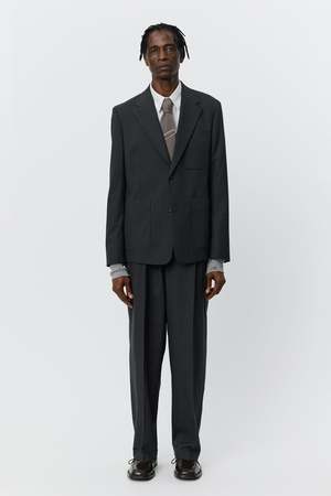 The Mail Jacket has a boxy fit with drop shoulders. It features a two-way zip, side pockets, sleeve and front body lining, and adjustable tabs at the waist. Cut from a lightweight, crisp tropical wool in black. Made in limited quantities from deadstock fabric.