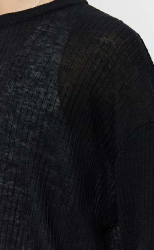 The Companion Jumper has a boxy fit with long sleeves and dropped shoulders. Knitted from a black linen-blend yarn with a sheer 4x2 rib knit throughout and finished with a 1x1 rib at the neckline, hem, and cuffs. This garment is crafted from carefully sourced natural yarn with an open structure. Free from synthetic fibres typically used to enhance stability in mass production, the knit is intended to adapt with timeexpanding with wear and gradually shaping to the body. To preserve its form, we recommend storing it folded and drying it flat.