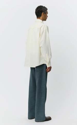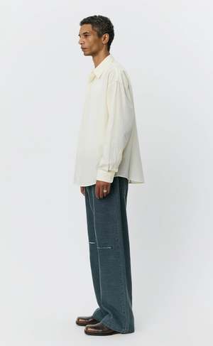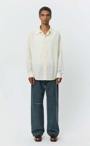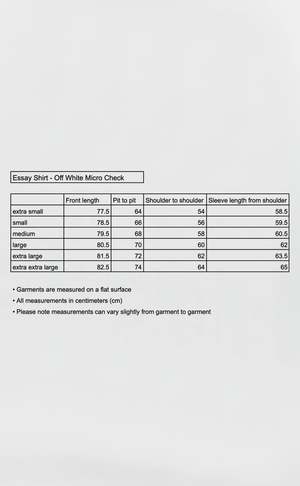 The Essay Shirt from mfpen has an oversized fit with drop shoulders and a rounded hem. It features a button placket, back yoke pleats with a raw-edged hanger loop, and a raw-edged patch at the chest and at the end of both side seams. Cut from a lightweight 100% cotton fabric with a soft hand feel, it comes in an off white, micro-structured tone-on-tone mini check. Fabric made in Portugal. Garment made in Portugal. Ivory resin buttons. Care instructions Machine wash cold. Dimensions Oversized fit. Model is 188 cm and wearing size medium. Please see measurements on the last slide. About the designer mfpen is a modern clothing brand that reinterprets classic garments through relaxed silhouettes and a commitment to responsible production. Drawing on both retrospective and countercultural notions, the brand reshapes classic European tailoring and design into timeless garments with understated, refined elegance. Its production process follows a Responsible Hierarchy, prioritizing high-quality European deadstock fabrics sourced from excess stock within the fashion industry. When deadstock isnt available, mfpen turns to recycled and biodegradable fabrics, using certified organic cotton as a last resort. Established by Sigurd Bank in 2016.
