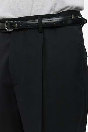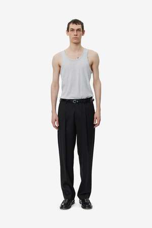 A clean, modern take on classic tailoring. The Formal Trousers from mfpen feature a regular fit with single pleats, a mid-rise, and a refined drape that moves naturally with you. Details include side and rear flap pockets, a button and hook-and-eye closure, and a YKK zip fly for a polished finish suited for both everyday wear and formal occasions. Pair them with the Single Breasted Blazer or Double Breasted Blazer in matching black wool for a complete, timeless suit. Style code: M325-046 Composition: 100% Wool.