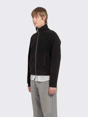 The Covet Full Zip has a relaxed fit with drop shoulders. It features a high neck, two-way zip, reversed flatlock seams, side welt pockets, and gathered cuffs and hem. Cut from a dry organic cotton jersey with an irregular knit structure in a bleached black. Model is 6'4" and wears size L.