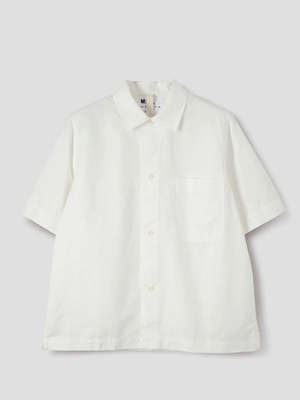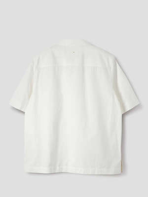 The PJ Shirt in Cotton Linen Chalk from MHL by Margaret Howell has a relaxed cut and is fabricated in lightly slubbed compact cotton linen poplin with a dry hand feel. The shirt is constructed with a large patch chest pocket and a side split hem with contrast herringbone tape facing. It is finished with stitch facing detailing. - 58% cotton 42% linen - Relaxed cut - Finished with corozo brace buttons - Made in Portugal - Machine wash Model height 187cm / 6 1.5.