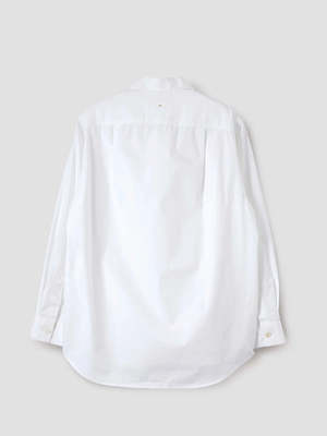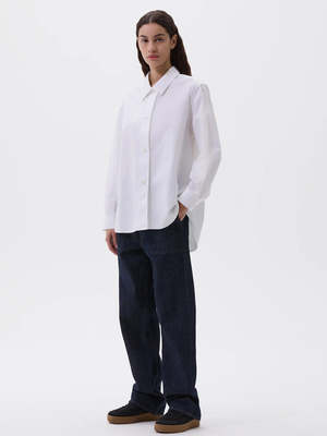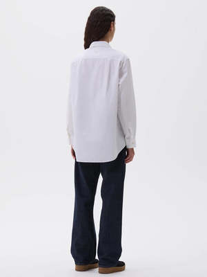 The Longline Shirt from MHL by Margaret Howell has a relaxed cut and longer length, fabricated in compact cotton poplin with a lightly brushed, papery hand feel. This minimalist shirt features a wide stitch-through placket, pleated back yoke, elongated hem, and corozo brace buttons. Made in Portugal. 100% cotton. Model height: 176.5cm / 5' 9.5".