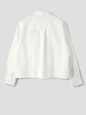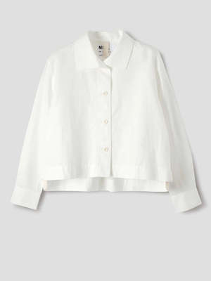 The Asymmetric Round Collar Shirt in Chalk from MHL has a regular, boxy cut and cropped length. It is fabricated in a cotton-linen blend with a soft hand feel. The shirt is constructed with a wide stitch-through placket, stepped vent split hem with herringbone tape facing, and a box pleat on the back yoke. - 58% cotton, 42% linen - Regular boxy cut, cropped length - Finished with corozo brace buttons - Made in Portugal - Machine wash Model height: 178 cm / 5'10".
