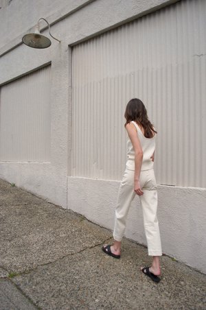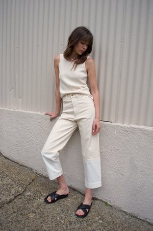 Straight leg jean with seamed tonal contrasting front panel below the knee. An updated version of the classic seamed jean. The pant sits at the natural waist, has a zipper and button closure and jean styling. 100% Cotton Made in USA