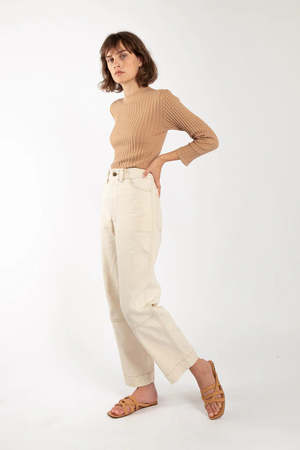 Both cute and practical, the Seamed Jean features a straight leg and seamed panels below the knees. The pant sits at the natural waist, has a zipper and button closure and jean styling. The pant is made from rigid, non stretch denim and will break in with wear. Material: 99% Cotton, 1% Lycra Color: Cream with Contrast Stitching Model Measurements: Height-5'8", Chest-33", Waist-25", Hip-33" Sustainability: - Made in USA - Global Organic Textile Standard (GOTS) Certified - Natural Material Usage